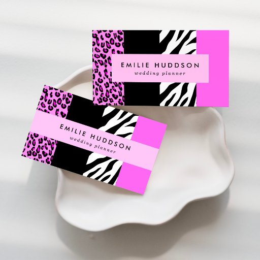 Elegante, stilvolle und raffinierte Visitenkarten mit Leoparden und Zebramuster in rosa Farbe. Modernes und trendiges Design, perfekt geeignet für Tierdruckliebhaber.