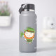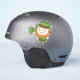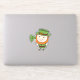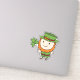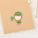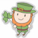 Comischer Cartoon Kobold mit einem grünen Hut und Anzug, hat einen Ingwer Bart und hält ein glückliches Kleeblatt.