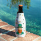 Leprechaun Clover Kleeblatt Patrick's Day Flasche Cooler. Ein festliches St. Patrick’s Day-Thema cooler mit einer Darstellung eines fröhlichen Mannes. Der Mann trägt einen grünen Hut mit einer schwarzen Band und einem goldenen Schnürchen und hat einen hellen roten Bart. Sein Gesicht hat einen freundlichen Ausdruck mit einem Lächeln. Das coolere ist von grünen und orangefarbenen Kleeblättern umgeben.