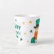 Leprechaun Clover Kleeblatt Patrick's Day Latte Tasse. Eine festliche St. Patrick’s Day-Tasse, die einen fröhlichen Mann darstellt. Der Mann trägt einen grünen Hut mit einer schwarzen Band und einem goldenen Schnürchen und hat einen hellen roten Bart. Sein Gesicht hat einen freundlichen Ausdruck mit einem Lächeln. Die Tasse ist von grünen und orangefarbenen Kleeblättern umgeben.