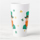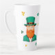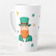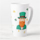Leprechaun Clover Kleeblatt Patrick's Day Latte Tasse. Eine festliche St. Patrick’s Day-Tasse, die einen fröhlichen Mann darstellt. Der Mann trägt einen grünen Hut mit einer schwarzen Band und einem goldenen Schnürchen und hat einen hellen roten Bart. Sein Gesicht hat einen freundlichen Ausdruck mit einem Lächeln. Die Tasse ist von grünen und orangefarbenen Kleeblättern umgeben.