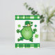 Feiern Sie den St. Patrick's Day mit diesem niedlichen irischen Design mit einem lustigen tanzenden Frosch, der einen Kobelhut trägt, umgeben von Kleeblättern. Grüne karierte Grenze. Ideal für Familienfeiern, Geburtstagsfeiern, St. Patrick's Day Party und Paraden. PinkInkArt Original!