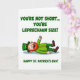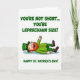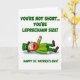 This card shows a cheerful cartoon leprechaun lounging on a white background, head tipped back as if laughing, with one arm lifted like he’s waving to a close friend 💚. He wears a tall green hat with a buckle, a buttoned green coat, and bright green trousers, and his fiery orange beard frames a wide grin and rosy cheeks. The relaxed pose and open smile make the scene feel like an inside joke shared between pals or sweethearts. Near the top, the main message appears in green uppercase letters: “YOU’RE NOT SHORT… YOU’RE LEPRECHAUN SIZE!”, spaced across the white space so it reads clearly above him ☘️. Lower on the design, “HAPPY ST. PATRICK’S DAY!” sits as a festive line in matching green, anchoring the layout. The greens range from deeper forest tones to lighter lime accents, keeping the outfit lively against the plain backdrop. The illustration uses simple shapes and flat color, with the leprechaun’s buckled hat and curled beard standing out as the key details. The final touch is the crisp white field surrounding him, giving plenty of breathing room around the green text and his raised arm.