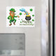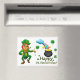 Cute, leprechaun with shamrocks, rainbow and a pot of gold, is featured on this rectangle magnet for St. Patrick's Day. With message. "Happy St. Patrick's Day!", makes this a great little decoration for the home or office! Also makes a nice little gift for the Irish holiday!
