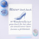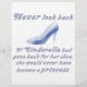 Schauen Sie nie zurück. Wenn Aschenputtel für ihren Schuh zurückgekehrt wäre, wäre sie nie Prinzessin geworden. Leben Sie jeden Tag voll und schauen Sie nie zurück; egal wie schlimm etwas aussehen mag, es gibt keinen Hinweis darauf, was gut daraus kommen könnte. Du lebst nur einmal, verschwende keine Zeit mit Bedauern! Ein schönes Design mit gläserner Schrift und natürlich dem ikonischen Aschenputtel.