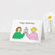 Zwei Frauen, die sich mit Gläsern Champagner und den Worten "Happy Anniversary" toasteln.