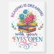 Lebhaftes, farbenfrohes Design mit einem Drachen mit Bücherstapel, der obere mit blauen und rosa Rosen offen. Der farbenfrohe Text lautet: "Lesen träumt mit offenen Augen". Dieses Design ist auf einer Vielzahl von Produkten erhältlich.