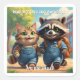 Reading, Rechtschreibung, Backpacks & Lächeln Square Aufkleber. Eine fröhliche Katze und ein Raccoon, gekleidet in Overalls und Rucksäcken, überspringen glücklich in die Schule. Sie Liebe Bücher zu lesen und schreiben Worte, begeistert für neue Abenteuer in ihren Lieblings-Klassenaktivitäten.