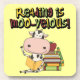 Eine Schwarzweiss-Kuh entspannt sich mit einem Stapel Büchern, wie er auf dem Ablesen ist T - Shirts MOO-Velous, Tassen, Karten, Aufkleber, Taschen, Magneten, keychains, Zeitschriften, Kissen und andere Kleider- und Geschenkeinzelteile liest, die fördern zu lesen. Groß für Buchwürmer irgendeines Alters!