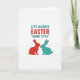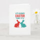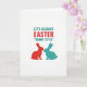 This card features a bright white background with stacked holiday wording that feels like an invitation between friends 🌷. Near the top, “LET’S CELEBRATE” appears in teal-green letters, with “BUNNY STYLE” placed nearby in the same teal-green tone. Centered and larger than the rest, “EASTER” stands out in energetic red, creating a lively contrast against the white space. Below the text, two long-eared rabbit silhouettes face each other, their noses angled close as if sharing a sweet, quiet moment 🐰. The left rabbit is red and the right rabbit is teal-green, echoing the colors used in the lettering for a balanced look. A faint shadow along the edges of the words and the rabbits adds gentle depth without crowding the design. The rabbits sit symmetrically beneath the centered red “EASTER,” with soft shading tracing their smooth outlines.