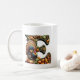 The design is a vibrant and festive representation of Thanksgiving, combining seasonal autumn elements with a playful cartoon turkey. At the heart of the image, the letter "E" stands out, adorned with vibrant leaves, pumpkins, and acorns, evoking a delicate autumnal atmosphere. Beside the letter stands a charming cartoon turkey, adding a touch of fun and personality to the design.
