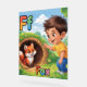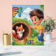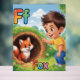 Cute and colorful alphabet poster featuring the letter F with a happy child and a small friendly fox illustration.