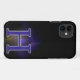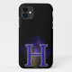 Persoonlijk I-phone hoesje met de letter H. (bijvoorbeeld je initiaal) Leuk als je naam met de H begint of die van een ander. Achter de letter is een raster en mysterieuze wolken met een licht die erop schijnt. De letter H is gevuld met een plaid patroon en een grijze rand erom heen. kleuren blauw, paars, geel en zwart.