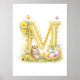 Delightful Letter M monogram poster featuring ornate gold filigree with a chipmunk holding a pink daisy beside Easter eggs in a nest. Bright yellow daffodils bloom along the scrollwork while both yellow and pink butterflies flutter gracefully. Gallery-quality Giclee print on durable 185gsm microporous resin-coated paper with semi-gloss finish and pigment-based inks for vibrant, fade-resistant color.