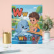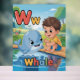 Cute and colorful alphabet poster featuring the letter W with a friendly smiling whale and a cheerful child illustration.