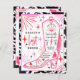 Space cowgirl, Disco letzten Rodeo themed Junggeselinnen-Abschied Einladung mit der Illustration eines Cowgirl Stiefel mit Rand, Rose, Blitz, Herzen und Sterne mit rot, rosa und schwarz Farbschema. Grenze ist Kuhdruck. Auf der Rückseite gibt es eine Route.