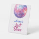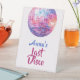 "Party Pedestal Sign! Dieses Schild mit einem lebendigen rosa Diskokugel und dem Retro-Buchstaben "Last Disco" Set den perfekten Ton für Ihre diskothematische Feier. Egal, ob Sie die Partygäste am Eingang begrüßen oder Ihrem Dekor Flair verleihen, dieses Podest ist ein glamouröses, das ganze Nacht hindurch leuchtendes Herzstück. Ein absolutes Muss für die letzte Diskothek der Braut - elegant, sehenswert und voller Spaß!"