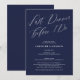 Letztes Abendessen vor "I do". Ein klassisches, stilvolles und elegantes, marineblaues Hochzeitsessen mit Probe am Abend, bevor es in kalligrafischem Schriftart geschrieben wurde. Perfekte Hochzeitsidee für Proben.