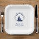 Nautikblau und weiß Brautparty / Junggeselinnen-Abschied Papier Teller mit Segelboot und Phrase "letzte Segel vor dem Schleier". Personalisieren Sie es mit Ihren Veranstaltungsdetails.