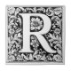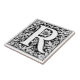 Mittelalterliche Illuminated Letter R Keramik Tile Eine Schwarz-Weiß-Vektor-Abbildung des Briefes in einem aufwändigen mittelalterlichen Stil, erstellt im Stil von Albrecht Dürer. Das Design ist ein Quadrat mit einem großen Blumenmotiv, umgeben von symmetrischen geometrischen Mustern und Wirbel.