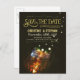Besondere und einzigartige Save the Date Postkarte mit wunderschönem whimsicalem Maurerglas mit leuchtenden Lichtern - Glühwürmchen. Moderne und Vintage Save the Date perfekt für rustikale Hochzeitsszenarien.