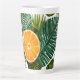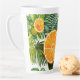 Das Bild entfaltet eine strahlende Melodie aus üppigen grünen Monstera- und Palmenblättern, die sich mit saftigen Orangenscheiben und exotischen Früchten in leuchtendem Gelb und Orange vereinen. Der lebendige Kontrast auf einem hellen Hintergrund verleiht eine fröhliche, tropische Wärme, die Energie und einen Hauch von Paradies ausstrahlt.