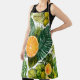 Das Bild entfaltet eine strahlende Melodie aus üppigen grünen Monstera- und Palmenblättern, die sich mit saftigen Orangenscheiben und exotischen Früchten in leuchtendem Gelb und Orange vereinen. Der lebendige Kontrast auf einem hellen Hintergrund verleiht eine fröhliche, tropische Wärme, die Energie und einen Hauch von Paradies ausstrahlt.