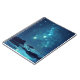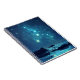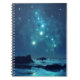Landschaftliches Bild des eisigen Nordens, wie man nachts sieht. Leuchtende Sterne und himmlische Formen sind zu sehen, blinkend, leuchtend und hell. Sie erhellen das felsige Gelände unten. Dunkelblaue Schatten werden in der Ferne auf die Felsen und das Eis geworfen.