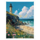 Ein klassischer Leuchtturm steht fest auf einem Felsvorsprung und beobachtet die sanften Wellen des Ozeans. Der Strand erstreckt sich endlos, gerahmt von großen Gräsern und Wildblumen, und schafft so eine zeitlose Küstenlandschaft. Ein zarter blauer Himmel mit einigen flauschigen Wolken ergänzt die ruhige Schönheit der Landschaft. Diese ruhige Landschaft besticht durch den ruhigen Power der Küste und die Ruhe, die sie mit sich bringt.