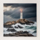Weißer Leuchtturm auf einem Felsvorsprung mit Sturmwolken