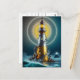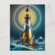 Ein goldener Leuchtturm steht hoch vor einem Hintergrund wirbelnder Wellen, beleuchtet von einem strahlenden Halo.