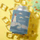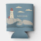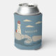 Diese personalisierte Dosenmanschette eignet sich hervorragend, um einen kalten zu genießen, während Sie von Ihrem Strandhaus-Deck aus den Blick auf den Ozean genießen. Es hat eine einfache Darstellung des nautischen Stils eines Leuchtturms in Rot und Creme oder Elfenbein. Der Leuchtturm liegt an einem felsigen Ufer mit unter ihm abstürzenden Wellen und cremefarbenen Wolken am Himmel. Die Grafik ist Set vor einem weichen, französischen blauen Hintergrund.
