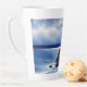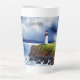 Stilvolle Latte-Tasse mit einem roten und weißen Leuchtturm auf grasbedeckten Klippen mit Blick auf den Ozean und bewölktem Himmel am Horizont - eine künstlich erzeugte digitale Aquarell. Personalisieren mit Namen oder Monogramm
