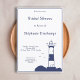 Elegante und einfache Brautdusche mit einer Illustration eines Leuchtturms in marineblau-blauen Tönen für eine Hochzeit zum Thema Meer und Wassersport!