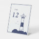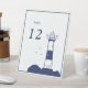 Elegante und schlichte Tischnummern mit einer Illustration eines Leuchtturms in marineblau für einen Hochzeitsempfang zum Thema Meer und Wassersport!