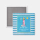 Ein individueller Dankeschön Magnet mit einem nautischen Thema. Das Design besteht aus einem blau gestreiften Muster und einem blauen Rahmen mit einem gelben Rahmen. Ein rot gestreifter Leuchtturm und ein Beachball, eine lächelnde Sonne und fliegende Seagull in der Entfernung positioniert innerhalb des Rahmens.