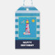 Ein Geschenktag mit einem nautischen Thema. Das Design besteht aus einem blau gestreiften Muster und einem blauen Rahmen mit einem gelben Rahmen. Ein rot gestreifter Leuchtturm und ein Beachball, eine lächelnde Sonne und fliegende Seagull in der Entfernung positioniert innerhalb des Rahmens.