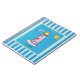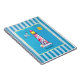 Spiral Notebook mit einem nautischen Thema. Entworfen mit einem rot gestreiften Leuchtturm und einem Beachball. Eine lächelnde Sonne und fliegender Seegras in der Ferne. Der Hintergrund hat ein blau gestreiftes Muster mit einem blauen Aquarellrahmen und einem gelben Rahmen, der oben platziert ist. Personalisieren Sie Ihre Daten mit einem Namen oder einem anderen Text.
