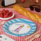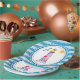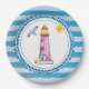 Teller zum Thema Wassersport. Entworfen mit einem blau gestreiften Muster und einem blauen nautischen Kreis oben. Ein rot gestreifter Leuchtturm und ein Beachball, mit einer lächelnden Sonne und fliegendem Seagull in der Entfernung positioniert innerhalb des Rahmens.