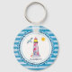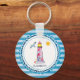 Ein Schlüsselanhänger zum Thema Wassersport. Das Design ist mit einem blau gestreiften Muster und einem blauen, kreisförmigen Rahmen mit einem nautischen Rahmen versehen, der oben platziert ist. Ein rot gestreifter Leuchtturm und ein Beachball, eine lächelnde Sonne und fliegende Seagull in der Entfernung positioniert innerhalb des Rahmens. Personalisieren Sie mit Ihrem Namen.