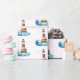 Rot-weiß gestreifter Leuchtturm mit blauer Welle und Möwen auf weißem Hintergrund. Die Hintergrundfarbe kann geändert werden.