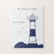 Ein Puzzle mit einer Illustration eines Leuchtturms in marineblau Tönen, um eine gute Zeit zu haben! Es könnte ein ausgezeichnetes Geschenk für ein Kind, ein Seemann oder ein Liebhaber von Ozeanen und Meeresküsten!