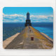 Ein langer Wellenbrecher erstreckt sich über das Wasser in Richtung eines entfernten Leuchtturms und lenkt den Blick entlang seiner verwitterten Oberfläche. Der Kontrast zwischen texturiertem Beton, offenem Wasser und Himmel erzeugt ein starkes Gefühl für Richtung und Tiefe.