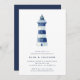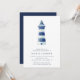 Die Einladungen unserer schicken Party-Party an der Küste beinhalten eine blaue und weiße Leuchtturmillustrierung mit den Details Ihrer Verlobungsparty in nautisch-marinebasierten blauen Schriftzeichen.