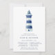 Unsere schicken Proben-Dinner-Einladungen an der Küste sind mit einer blauen und weißen Leuchtturmillustrierung versehen, in der Sie Ihre Zeremonie Probe und Dinner-Details in marineblauen Schriftzeichen sehen. Einladungen kehren zu massiven nautischen Marine blau.