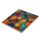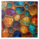 Ein faszinierendes, abstraktes Kunstwerk, das farbenfrohen, miteinander verbundenen Zellen ähnelt, oder farbiges Glas mit goldenen, strukturierten Rahmen.