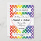 Diese hochkarätige thematische Hochzeitseinladung ist eine farbenfrohe und einzigartige Möglichkeit, Familie und Freunde zu Ihren kommenden Nuptials einzuladen. Mit einem Hintergrund von Rot, Gelb, Blau, Grün und lila mit weißen Herzen überzogen, ist es eine helle und fröhliche Art, Ihre Liebe zu verkünden. Namen, Daten und Adressen können nach Ihren Angaben geändert werden. Es ist eine wirklich einmalige Einladung für das Paar.