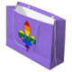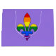 Design mit Fleur-de-lis-Symbol (Lilienfleur oder Lilie-Blume) mit Regenbogenstreifen aus LGBT (lesbisch, schwul, bisexuell und transsexuell)-Fahne, Gay Pride-Design auf lila Hintergrund