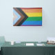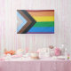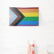 Die "Progress"-Variante der Regenbogenflagge fügt ein Zickzack entlang der Weste hinzu, das schwarze, braune, hellblaue, rosa und weiße Streifen aufweist, um diese Gemeinschaften (farbige Randgruppen, TransIndividuen, HIV/AIDS-Bewohner und verloren gegangene Menschen) in den Vordergrund zu rücken; "der Pfeil zeigt auf, dass die Vorwärtsbewegung sichtbar ist, während er am links Rand liegt, dass Fortschritte noch gemacht werden müssen."