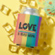 Zeige deinen Stolz auf dieses LGBTQ-Thema kann cooler sein mit dem Wortlaut Liebe ist nie falsch in schwarzen Schriften mit einem kleinen Regenbogenherz verziert, auf einem bunten Hintergrund Regenbogenflagge.